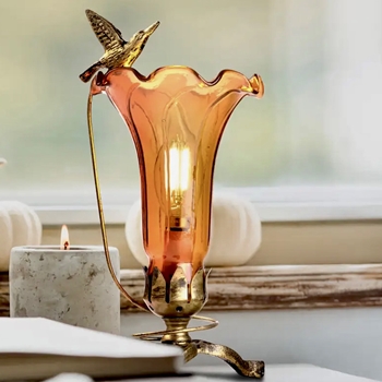→ Lamp - Lily & Hummingbird Accent Stained Glass Amber 6x5x10in