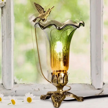→ Lamp - Lily & Hummingbird Accent Stained Glass Green & Amber 6x5x10in